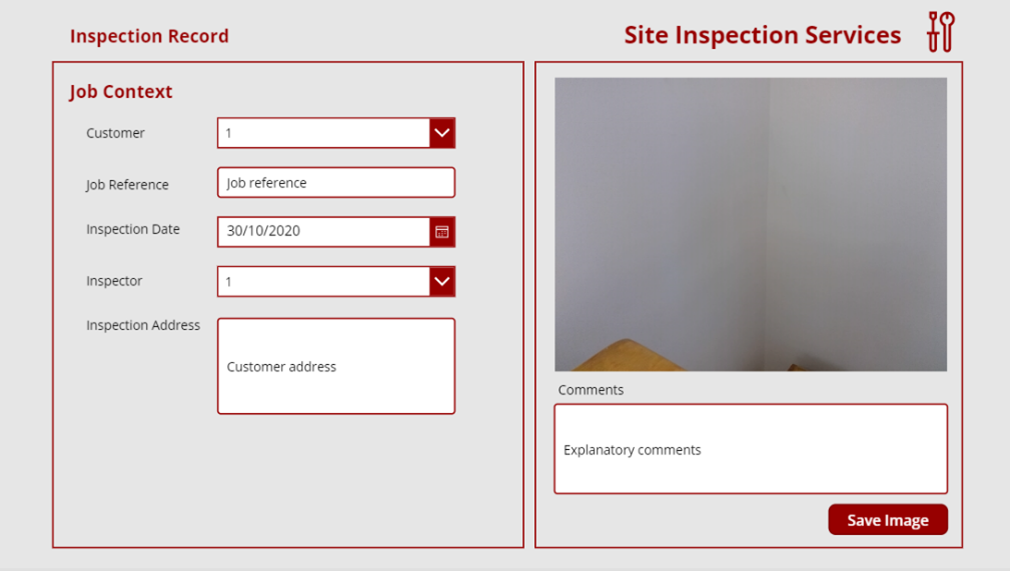 This app asks the inspector to note once which job they are on and where. After that they can keep taking photos using the camera in the right half of the screen, adding their comments as they go. Every time they tap ‘Save Image’, the picture is stored in SharePoint and the information on the left side is stored in columns against the picture. When they get back to the office the data is already stored, and when they come to write the full report they can retrieve the pictures just by searching on any of the data they put in the left side.
