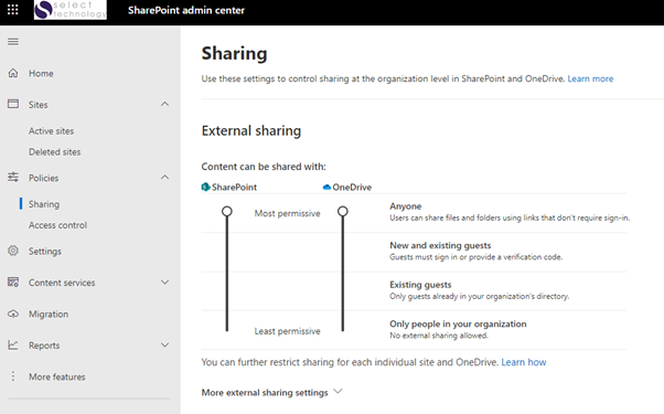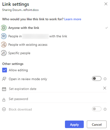 SharePoint allows very specific controls on what is shared and how. You can share at the individual file level, and control whether that’s a general link that anyone can access or a limited link that will only work for named people. You can put time limits on, so a share expires after a certain period and you can control whether the people you are sharing with can download the files or just view in a browser, and whether they can edit the files.