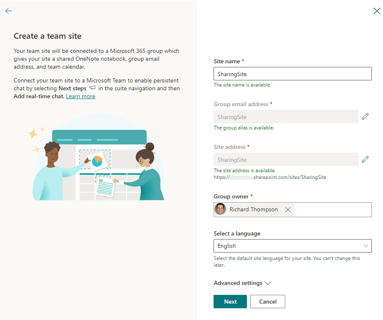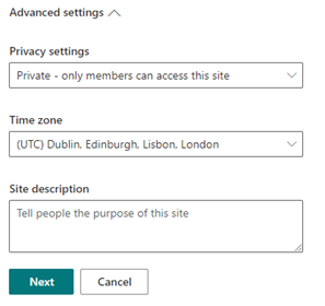 As always you get the option to create either a ‘Team site’ or a ‘Communication site’. The difference is aesthetic – they can both do what we need here, but we generally choose Team site. Then you get this dialog screen: