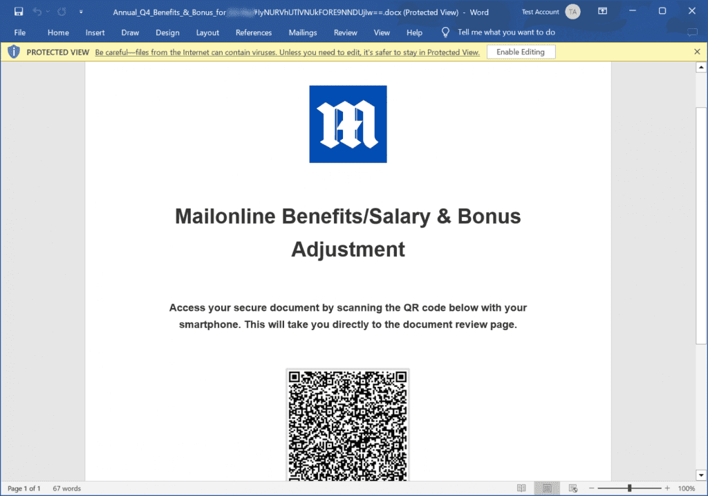 Recipients then open the attachment, and Word “helpfully” offers to repair the file. Once repaired, any macros will try to run (this should be disabled by default, but can still happen) or the recipient may be met with a QR code like this: