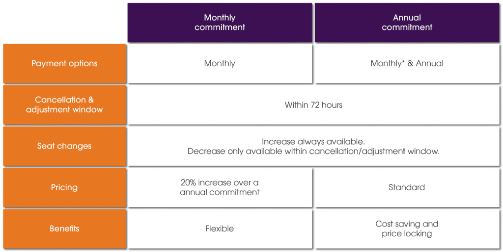 An annual commitment for a period of 12 months at a fixed price, paid monthly or annually upfront (subject to credit checks).