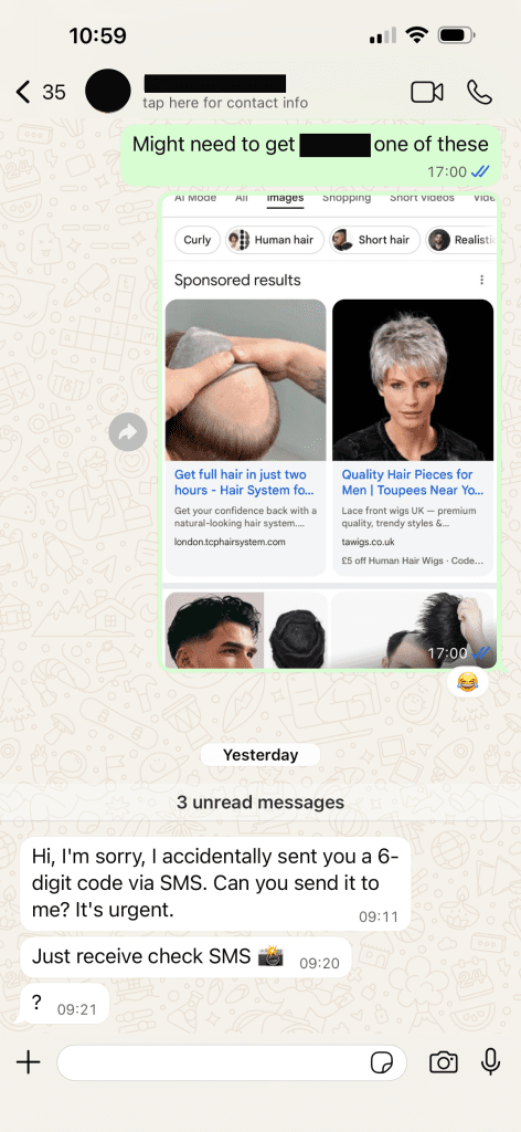 The message typically asks for help, claiming they’ve been locked out of their account, need to “verify” something urgently or they have “accidently” sent you a text (see the real example that a member of our team received, ignore the previous conversation 🤣). Shortly after, you receive a six‑digit code by SMS (not via WhatsApp). The scammer will then ask you to share that code with them.