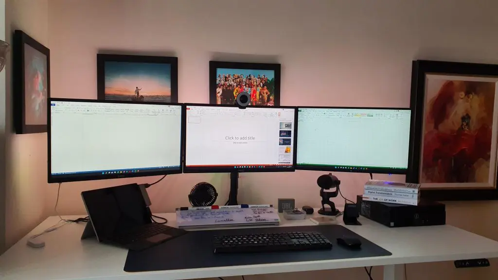 Firstly, a quick snapshot of my usual setup: a Surface Pro with a docking station, two external monitors on a rack on my desk, an external keyboard and mouse. Pretty standard fare. The slightly unusual elements are that I have an external webcam for meetings, and an external microphone to sharpen the sound quality. I also have a sit/stand desk and I missed that!