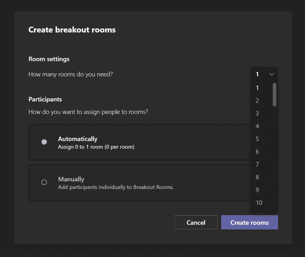 This will then provide you a screen to select how many rooms and what to do with the participants. You can select up to 50 rooms, so it’s great for larger team meetings, as well as for large scale virtual conferences.